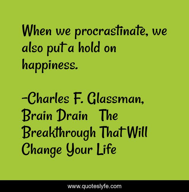 This page presents the quote "When we procrastinate, we also put a hold on happiness.". Author of this quote is Charles F. Glassman, Brain Drain The Breakthrough That Will Change Your Life. This quote is about discipline, spiritual, success, law-of-attraction, law-of-attraction-books, wisdom, putting-off, intention, procrastination,.