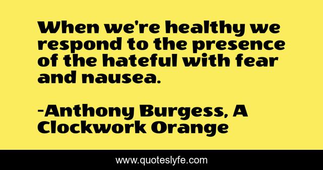 This page presents the quote "When we're healthy we respond to the presence of the hateful with fear and nausea.". Author of this quote is Anthony Burgess, A Clockwork Orange. This quote is about a-clockwork-orange, book, books, anthony-burgess,.