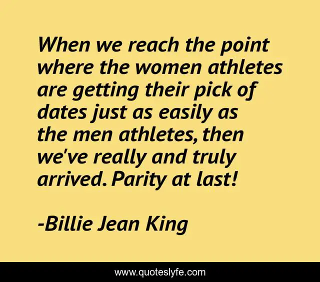 This page presents the quote "When we reach the point where the women athletes are getting their pick of dates just as easily as the men athletes, then we've really and truly arrived. Parity at last!". Author of this quote is Billie Jean King. This quote is about men, reach, women,.