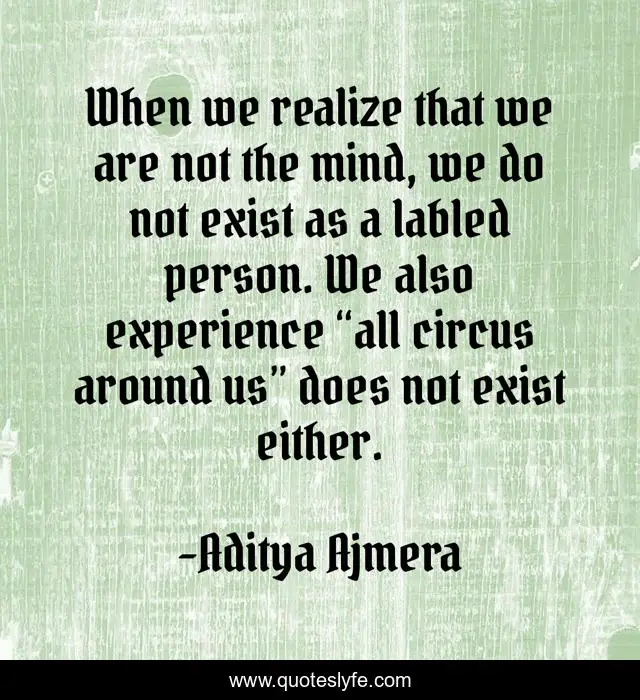 This page presents the quote "When we realize that we are not the mind, we do not exist as a labled person. We also experience “all circus around us” does not exist either.". Author of this quote is Aditya Ajmera. This quote is about mind, life-and-living, circus,.