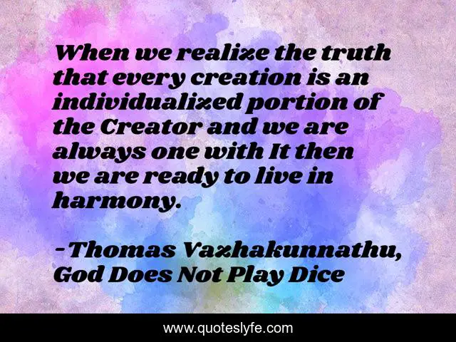 This page presents the quote "When we realize the truth that every creation is an individualized portion of the Creator and we are always one with It then we are ready to live in harmony.". Author of this quote is Thomas Vazhakunnathu, God Does Not Play Dice. This quote is about enthusiasm, philosophy, inspirational, self-development,.