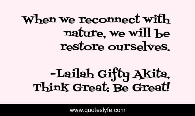 "Lailah Gifty Akita, Think Great: Be Great! Quotes." Quoteslyfe.com, 2025. Sat. 06 Dec. 2025. <https://www.quoteslyfe.com/quote/When-we-reconnect-with-nature-we-will-72993>.