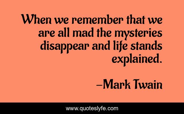 This page presents the quote "When we remember that we are all mad the mysteries disappear and life stands explained.". Author of this quote is Mark Twain. This quote is about sanity, insanity,.