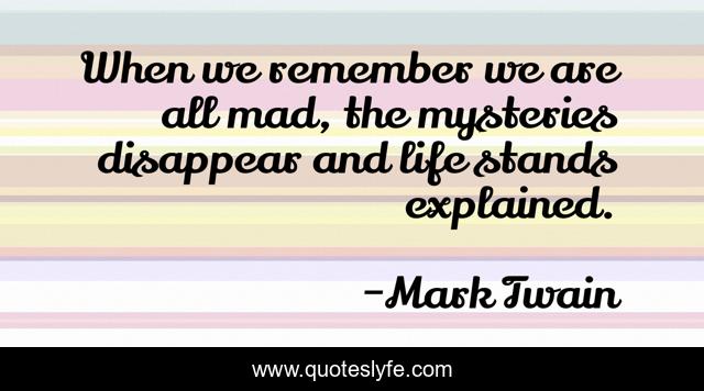 This page presents the quote "When we remember we are all mad, the mysteries disappear and life stands explained.". Author of this quote is Mark Twain. .