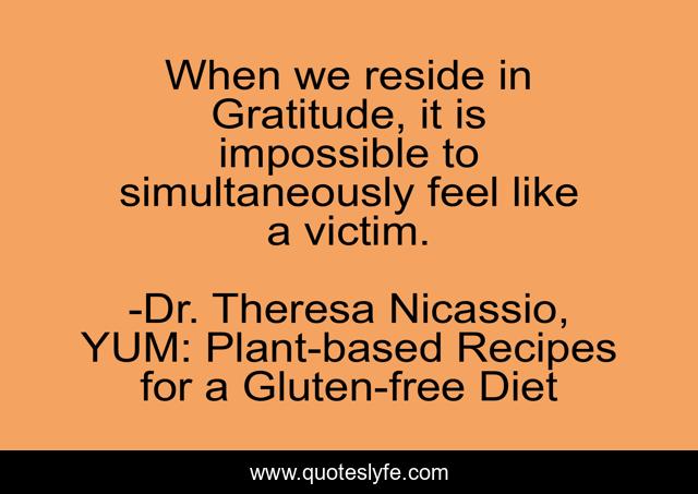 This page presents the quote "When we reside in Gratitude, it is impossible to simultaneously feel like a victim.". Author of this quote is Dr. Theresa Nicassio, YUM: Plant-based Recipes for a Gluten-free Diet. This quote is about gratitude, empowering, empowerment, positive-thinking, positive-psychology, positive-thoughts, mindset,.