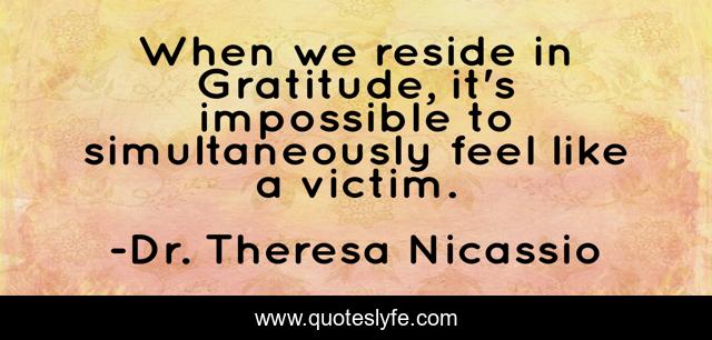 This page presents the quote "When we reside in Gratitude, it's impossible to simultaneously feel like a victim.". Author of this quote is Dr. Theresa Nicassio. This quote is about gratitude, empowering, empowerment, positive-thinking, positive-psychology, positive-thoughts, mindset,.