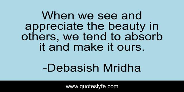 This page presents the quote "When we see and appreciate the beauty in others, we tend to absorb it and make it ours.". Author of this quote is Debasish Mridha. This quote is about appreciate-the-beauty-in-others, beauty, philosophy, debasish-mridha, quotes, debasish-mridha-md, inspirational, beauty-of-others, enthusiasm,.