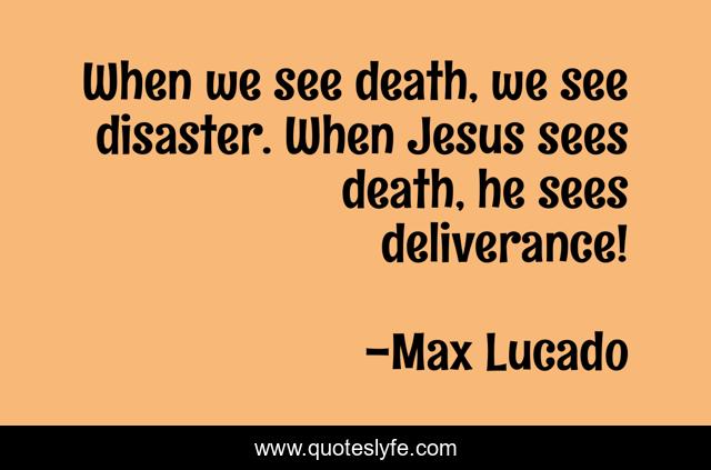 This page presents the quote "When we see death, we see disaster. When Jesus sees death, he sees deliverance!". Author of this quote is Max Lucado. This quote is about heaven, death, religious,.