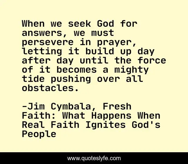 This page presents the quote "When we seek God for answers, we must persevere in prayer, letting it build up day after day until the force of it becomes a mighty tide pushing over all obstacles.". Author of this quote is Jim Cymbala, Fresh Faith: What Happens When Real Faith Ignites God's People. .