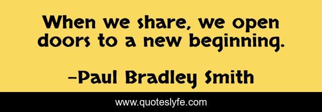 This page presents the quote "When we share, we open doors to a new beginning.". Author of this quote is Paul Bradley Smith. This quote is about life-hack, share, open-doors, wisdom, quotes, quote, new-beginnings, sharing-is-caring,.