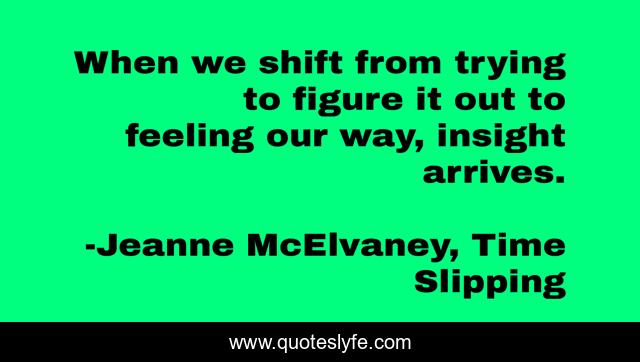This page presents the quote "When we shift from trying to figure it out to feeling our way, insight arrives.". Author of this quote is Jeanne McElvaney, Time Slipping. This quote is about being-happy, self-awareness, old-maggie-s-spirit-whispers, change-your-life, life-purpose, gotospirit-com, jeanne-mcelvaney, self-improvement, personal-development,.