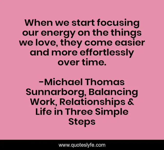 This page presents the quote "When we start focusing our energy on the things we love, they come easier and more effortlessly over time.". Author of this quote is Michael Thomas Sunnarborg, Balancing Work, Relationships & Life in Three Simple Steps. This quote is about love, passion, focus, affection, inspiration,.
