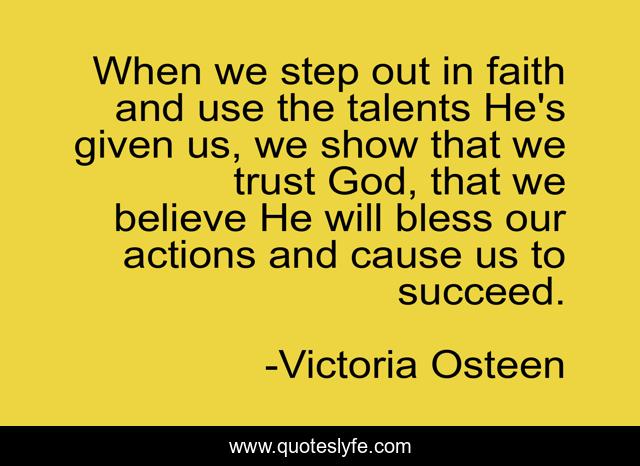 This page presents the quote "When we step out in faith and use the talents He's given us, we show that we trust God, that we believe He will bless our actions and cause us to succeed.". Author of this quote is Victoria Osteen. This quote is about trust, god, believe,.