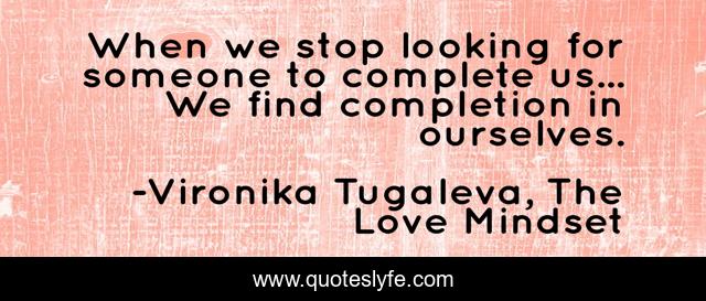 This page presents the quote "When we stop looking for someone to complete us... We find completion in ourselves.". Author of this quote is Vironika Tugaleva, The Love Mindset. This quote is about completion, relationships, self-love, soul-mates, compete, healing, self-esteem,.