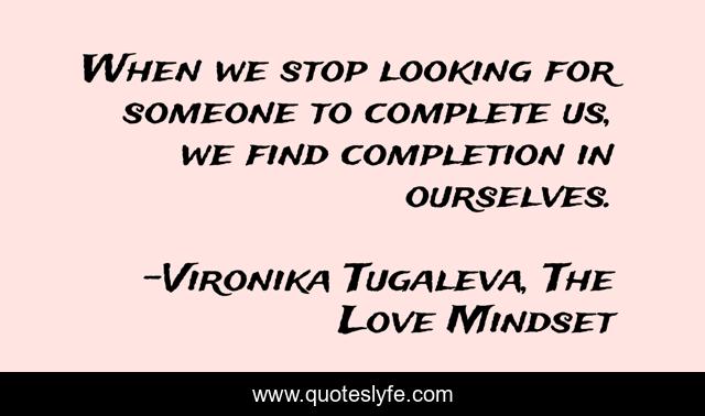 This page presents the quote "When we stop looking for someone to complete us, we find completion in ourselves.". Author of this quote is Vironika Tugaleva, The Love Mindset. This quote is about completion, relationships, self-love, love, complete, dependence, healing, co-dependence, wholeness,.