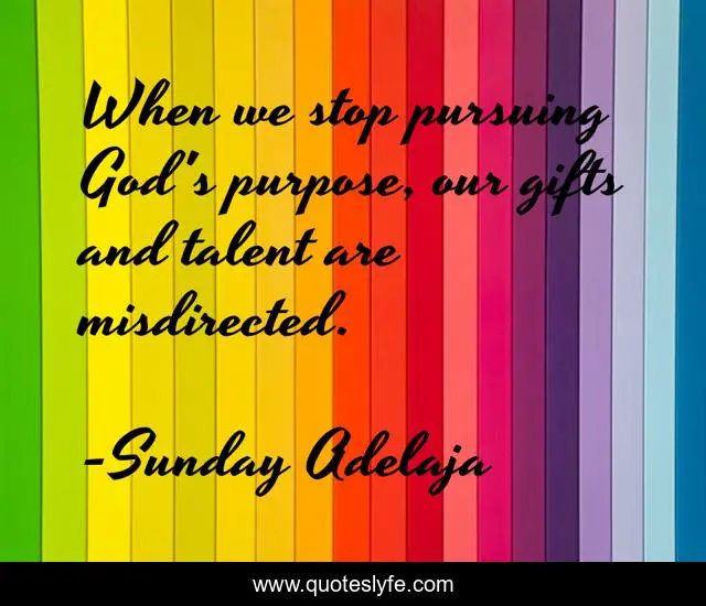 This page presents the quote "When we stop pursuing God's purpose, our gifts and talent are misdirected.". Author of this quote is Sunday Adelaja. This quote is about gifts, god-s-purpose, talent, misdirected, pursuing,.