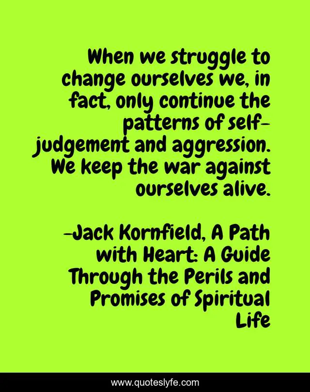 This page presents the quote "When we struggle to change ourselves we, in fact, only continue the patterns of self-judgement and aggression. We keep the war against ourselves alive.". Author of this quote is Jack Kornfield, A Path with Heart: A Guide Through the Perils and Promises of Spiritual Life. This quote is about aggression, stopping-the-war, struggle, self-judgement, war,.