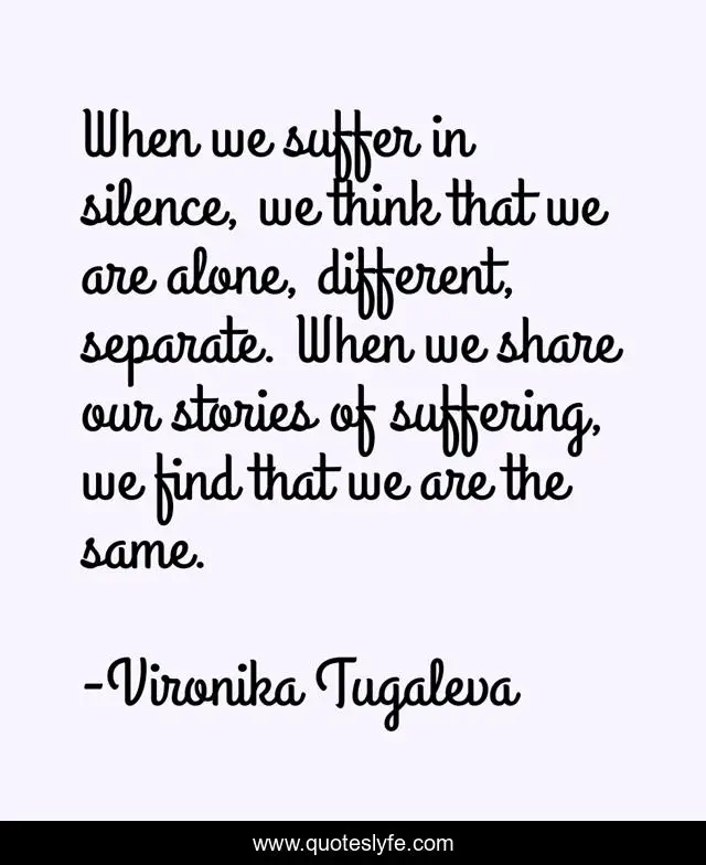 This page presents the quote "When we suffer in silence, we think that we are alone, different, separate. When we share our stories of suffering, we find that we are the same.". Author of this quote is Vironika Tugaleva. This quote is about tribe, sharing, honesty, loneliness, vulnerability, community, suffering, stories, truth,.