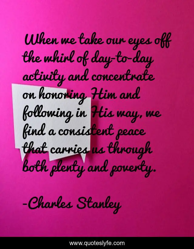 This page presents the quote "When we take our eyes off the whirl of day-to-day activity and concentrate on honoring Him and following in His way, we find a consistent peace that carries us through both plenty and poverty.". Author of this quote is Charles Stanley. This quote is about eyes, poverty, find,.