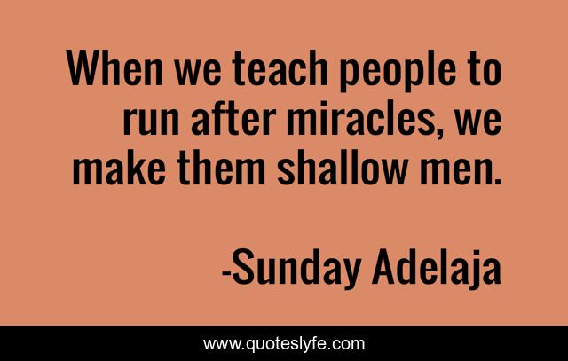 This page presents the quote "When we teach people to run after miracles, we make them shallow men.". Author of this quote is Sunday Adelaja. This quote is about miracles, teach, shallow, miracle,.