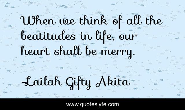 This page presents the quote "When we think of all the beatitudes in life, our heart shall be merry.". Author of this quote is Lailah Gifty Akita. This quote is about life, joy, inspirationalrational, thankful, lessons-learnt, beatitudes, happiness,.