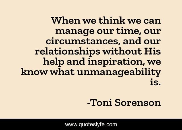 This page presents the quote "When we think we can manage our time, our circumstances, and our relationships without His help and inspiration, we know what unmanageability is.". Author of this quote is Toni Sorenson. This quote is about god, life, addiction-and-recovery, management, time,.