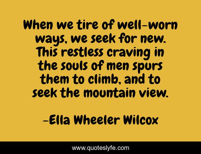 This page presents the quote "When we tire of well-worn ways, we seek for new. This restless craving in the souls of men spurs them to climb, and to seek the mountain view.". Author of this quote is Ella Wheeler Wilcox. This quote is about mountain, climb, view,.
