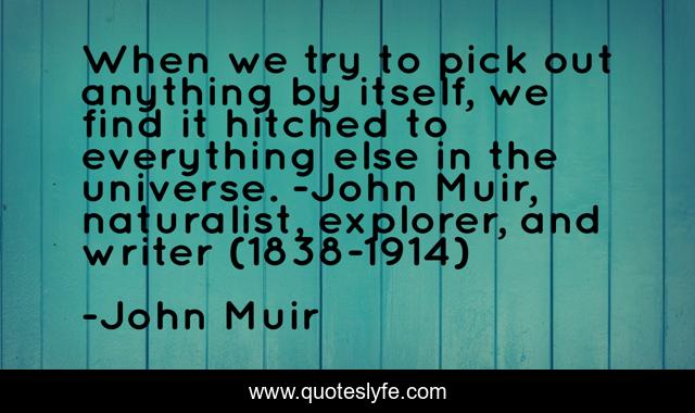 This page presents the quote "When we try to pick out anything by itself, we find it hitched to everything else in the universe. -John Muir, naturalist, explorer, and writer (1838-1914)". Author of this quote is John Muir. This quote is about connections, life, nature, interdependency, environment, inspirational, enthusiasm, marvel, wonder,.