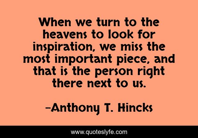 This page presents the quote "When we turn to the heavens to look for inspiration, we miss the most important piece, and that is the person right there next to us.". Author of this quote is Anthony T. Hincks. This quote is about life, love, philosophy, person, important, stars, heavens, miss, affection,.