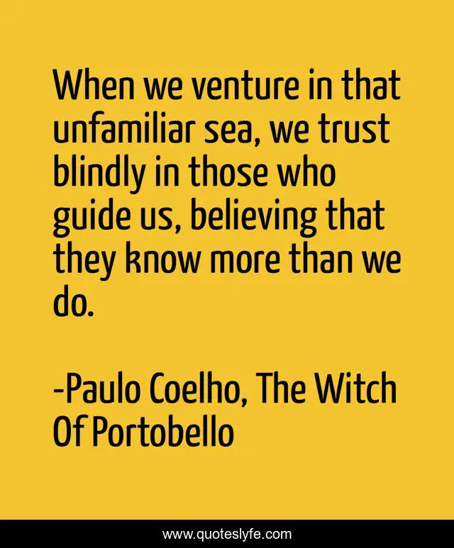 This page presents the quote "When we venture in that unfamiliar sea, we trust blindly in those who guide us, believing that they know more than we do.". Author of this quote is Paulo Coelho, The Witch Of Portobello. This quote is about knowledge, guidance, maxim, wisdom, coelho, truth, trust, sea,.