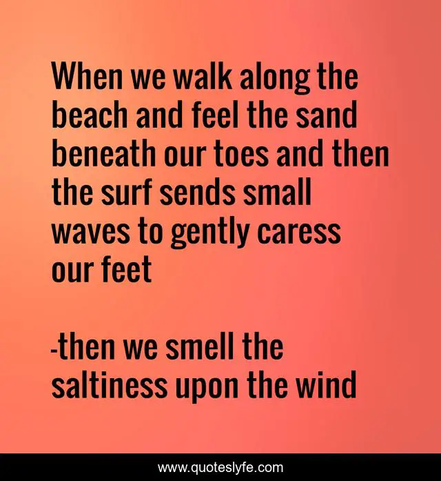 This page presents the quote "When we walk along the beach and feel the sand beneath our toes and then the surf sends small waves to gently caress our feet". Author of this quote is then we smell the saltiness upon the wind. .