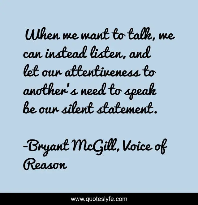 This page presents the quote "When we want to talk, we can instead listen, and let our attentiveness to another's need to speak be our silent statement.". Author of this quote is Bryant McGill, Voice of Reason. This quote is about listening, silence, understanding-oneself-and-others,.