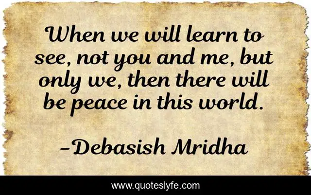 This page presents the quote "When we will learn to see, not you and me, but only we, then there will be peace in this world.". Author of this quote is Debasish Mridha. This quote is about life, love, knowledge, inspirational, intelligence, philosophy, wisdom, quotes, affection,.