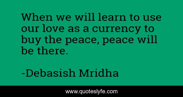 This page presents the quote "When we will learn to use our love as a currency to buy the peace, peace will be there.". Author of this quote is Debasish Mridha. This quote is about life, love, knowledge, inspirational, intelligence, philosophy, wisdom, quotes, affection,.