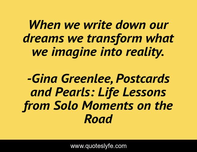 This page presents the quote "When we write down our dreams we transform what we imagine into reality.". Author of this quote is Gina Greenlee, Postcards and Pearls: Life Lessons from Solo Moments on the Road. This quote is about transformation, imagination, write-down-your-dreams, dream-big,.