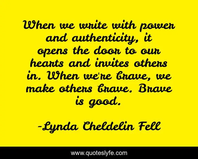 This page presents the quote "When we write with power and authenticity, it opens the door to our hearts and invites others in. When we're brave, we make others brave. Brave is good.". Author of this quote is Lynda Cheldelin Fell. This quote is about heart, brave, healing, writing,.