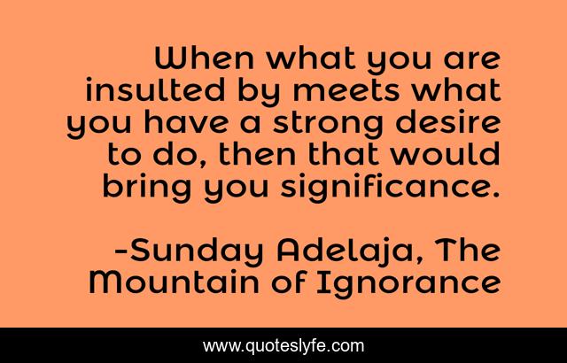 This page presents the quote "When what you are insulted by meets what you have a strong desire to do, then that would bring you significance.". Author of this quote is Sunday Adelaja, The Mountain of Ignorance. This quote is about desire, mountain, life, darkness, power, danger, god, people, ignorance,.