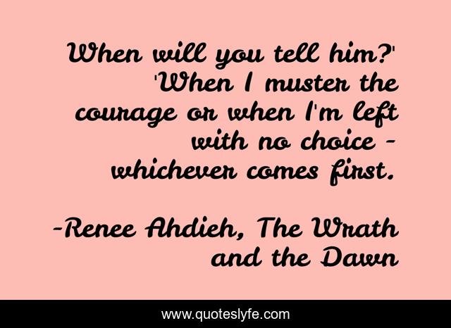 This page presents the quote "When will you tell him?' 'When I muster the courage or when I'm left with no choice - whichever comes first.". Author of this quote is Renee Ahdieh, The Wrath and the Dawn. This quote is about courage, choice,.