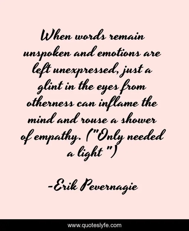 This page presents the quote "When words remain unspoken and emotions are left unexpressed, just a glint in the eyes from otherness can inflame the mind and rouse a shower of empathy. ("Only needed a light ")". Author of this quote is Erik Pevernagie. This quote is about eyes, just, unexpressed, glint, otherness, mind, emotions, inflame, remain,.
