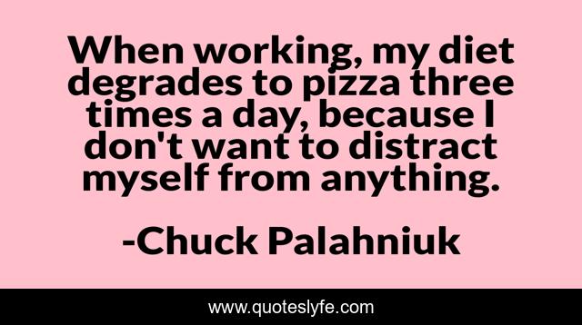 This page presents the quote "When working, my diet degrades to pizza three times a day, because I don't want to distract myself from anything.". Author of this quote is Chuck Palahniuk. This quote is about myself, day, pizza,.