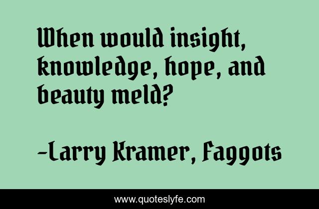 This page presents the quote "When would insight, knowledge, hope, and beauty meld?". Author of this quote is Larry Kramer, Faggots. This quote is about insight, beauty, hope, knowledge,.