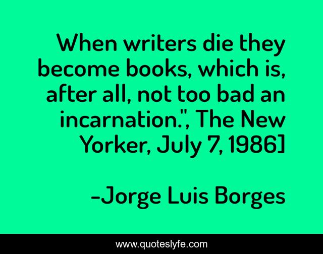 This page presents the quote "When writers die they become books, which is, after all, not too bad an incarnation.", The New Yorker, July 7, 1986]". Author of this quote is Jorge Luis Borges. This quote is about death, literature, immortality, books, words, reading, transformation,.