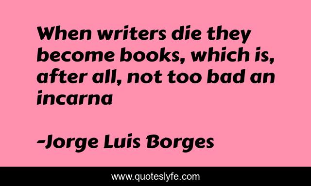 This page presents the quote "When writers die they become books, which is, after all, not too bad an incarna". Author of this quote is Jorge Luis Borges. This quote is about death, literature, immortality, books, words, reading, transformation,.