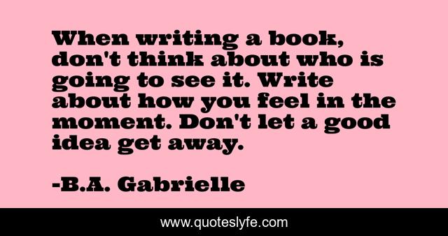 This page presents the quote "When writing a book, don't think about who is going to see it. Write about how you feel in the moment. Don't let a good idea get away.". Author of this quote is B.A. Gabrielle. This quote is about good-ideas, author,.