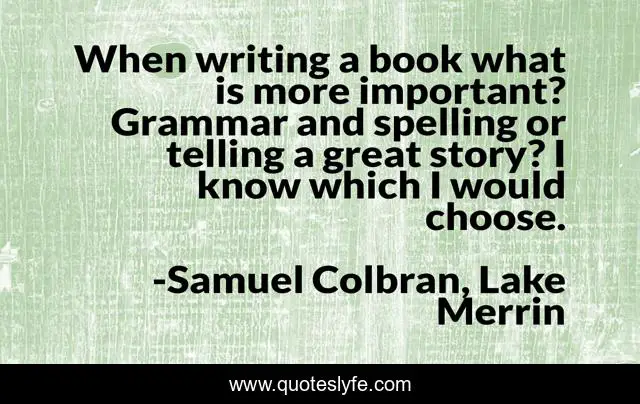 This page presents the quote "When writing a book what is more important? Grammar and spelling or telling a great story? I know which I would choose.". Author of this quote is Samuel Colbran, Lake Merrin. This quote is about writing-philosophy, writing-life, writing-process,.