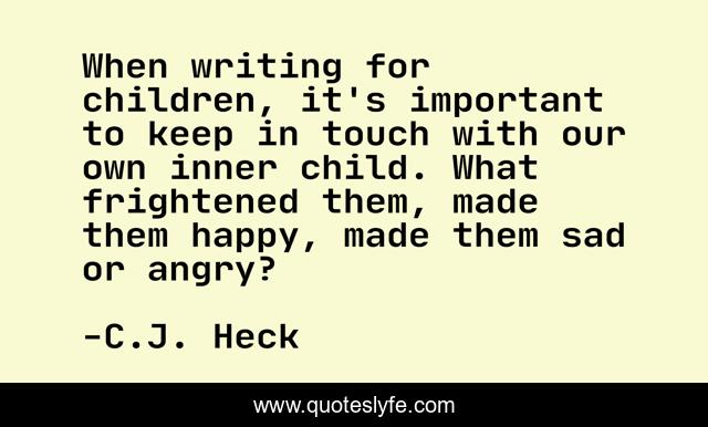 This page presents the quote "When writing for children, it's important to keep in touch with our own inner child. What frightened them, made them happy, made them sad or angry?". Author of this quote is C.J. Heck. This quote is about be-aware-of-inner-child, writing-for-children, feelings,.
