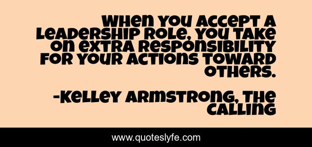 This page presents the quote "When you accept a leadership role, you take on extra responsibility for your actions toward others.". Author of this quote is Kelley Armstrong, The Calling. This quote is about leadership, responsibility, leaders, actions,.