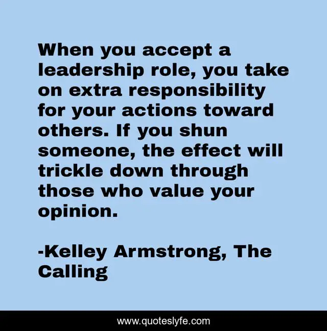 This page presents the quote "When you accept a leadership role, you take on extra responsibility for your actions toward others. If you shun someone, the effect will trickle down through those who value your opinion.". Author of this quote is Kelley Armstrong, The Calling. .