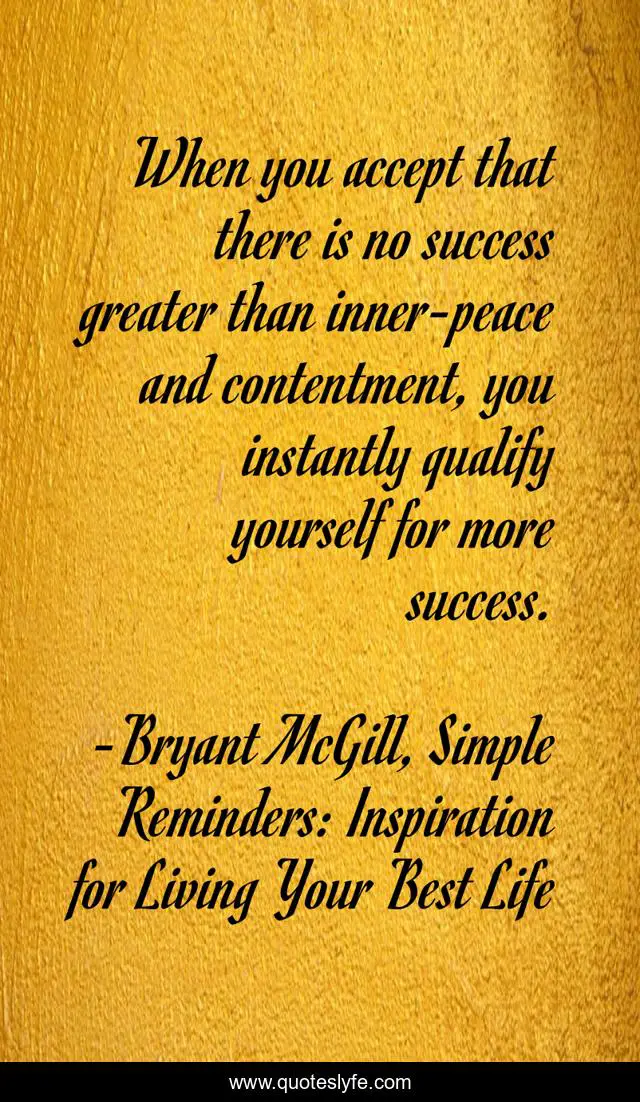This page presents the quote "When you accept that there is no success greater than inner-peace and contentment, you instantly qualify yourself for more success.". Author of this quote is Bryant McGill, Simple Reminders: Inspiration for Living Your Best Life. .