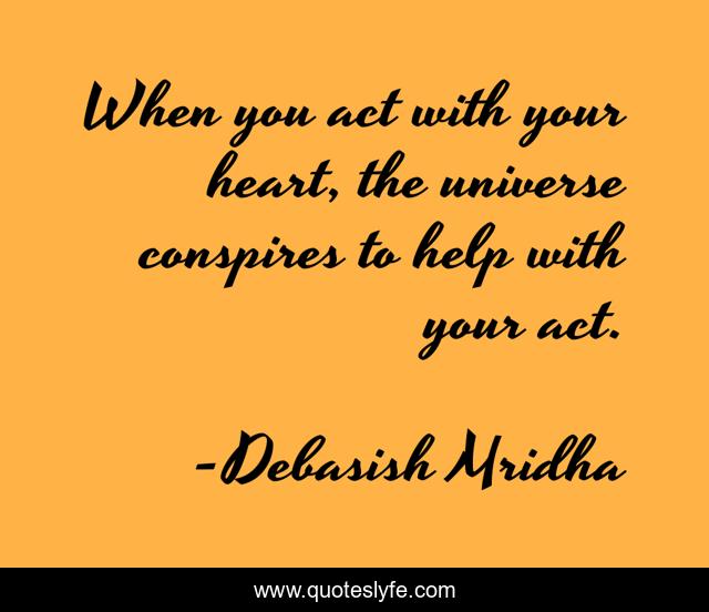 This page presents the quote "When you act with your heart, the universe conspires to help with your act.". Author of this quote is Debasish Mridha. This quote is about life, love, knowledge, inspirational, intelligence, philosophy, wisdom, quotes, affection,.